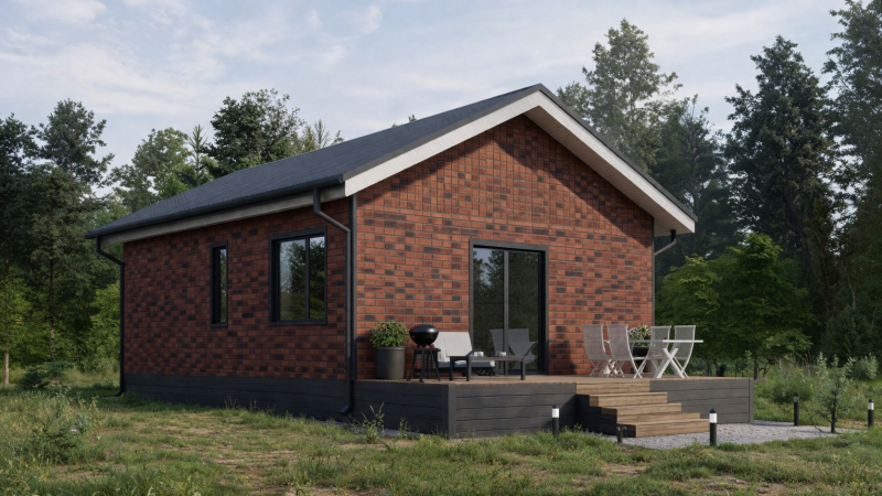 Компактный дом, есть все необходимое: две спальных комнаты, просторная кухня с зоной ТВ, сан.узел и гардеробная. Терраса 17.5 м.кв.