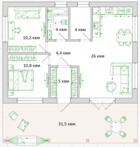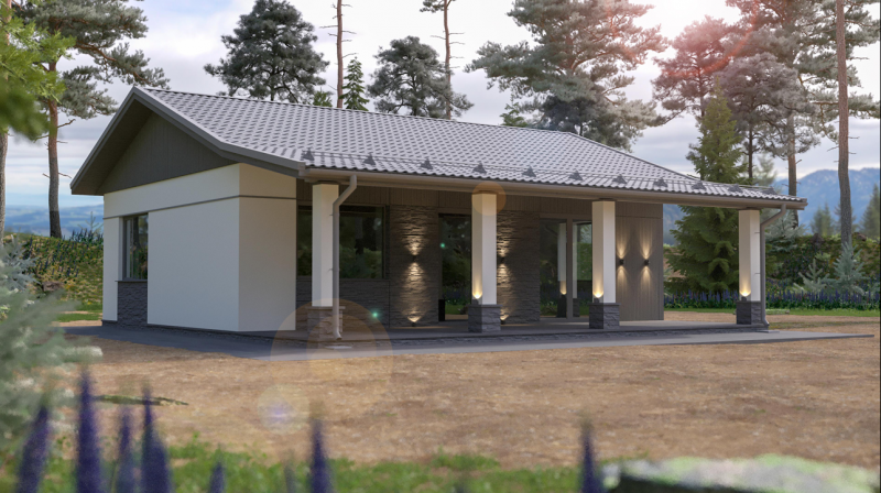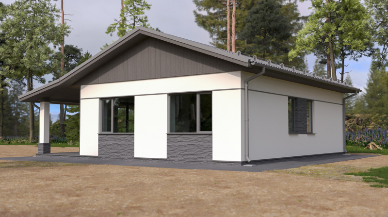 Кровля в варианте проекта 73 м2: кровля 4х скатная с отделкой из металлочерепицы, утеплитель насыпная мин вата, пароизоляция и ветрозащита. Водостоками и снегозадержателями комплектуется по дополнительному соглашению с клиентом. Подшив свесов кровли, осуществляется софитами. Балка муэрлата:100х150 мм, стропила и балки перекрытия 50х200 мм, обрешетка верхняя 32мм (через ряд, в местах повышенного скопления снега у конька и перед свесом обрешетка укладывается сплошным слоем.) Внутренняя обрешетка укладывается через 2 доски с последующим крепление для ГКЛ листов влагостойких.