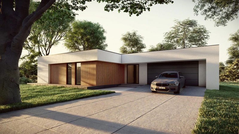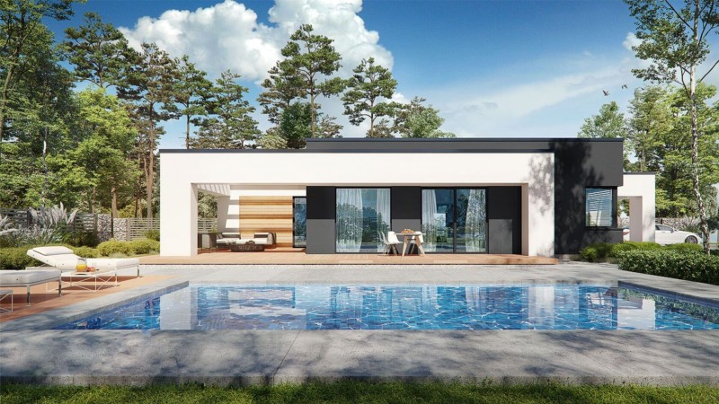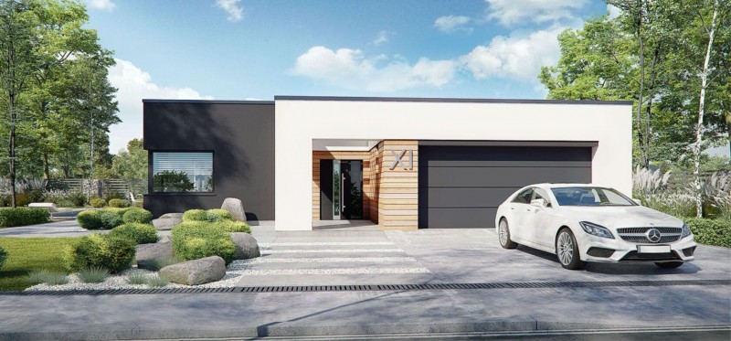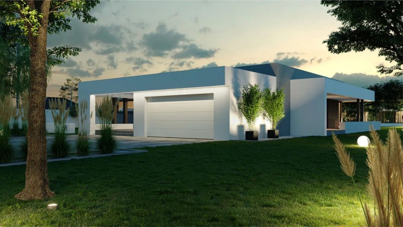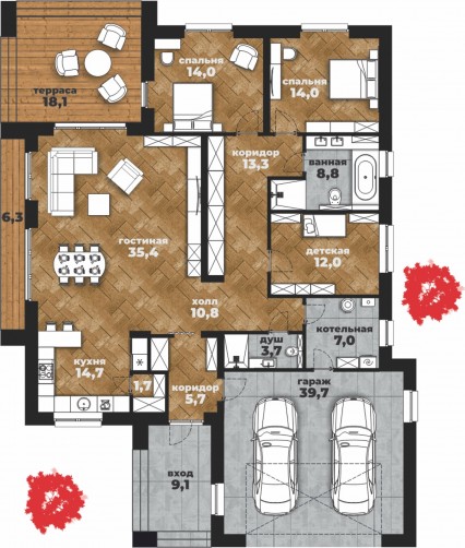 Гараж на два авто, котельная с функцией прачечной. Два полноценных санузла с ванной и душевой. Зона хранения расположена в широком коридоре. В зоне кухни запроектирована кладовая, а гостиная имеет отделочный выход на летнюю террасу. А столовая и гостиная имеют выход на летнюю террасу.
