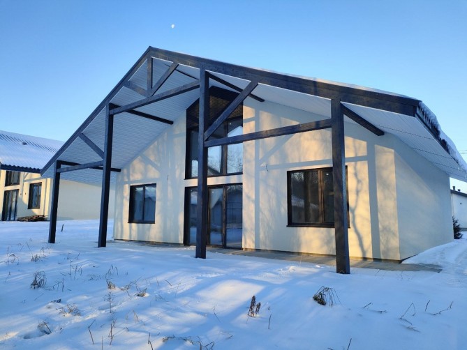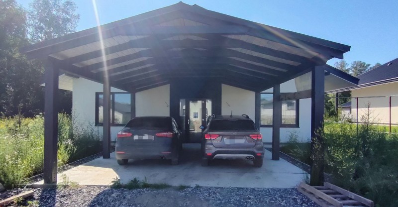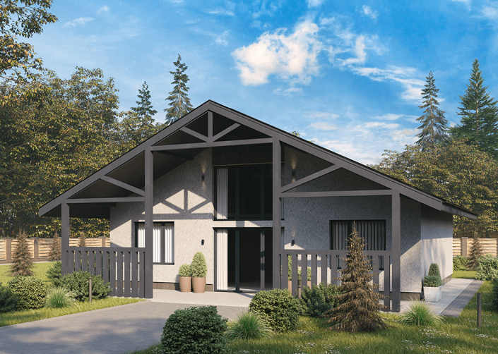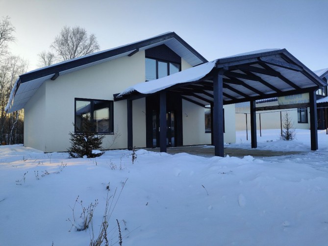 Дом функционально разделен на зоны кухни-гостиной, спального блока «детские» и спального блока «мастер спальни». Кухня-гостиная расположена в середине дома. Парковка для авто выполнена под навесом, рядом с главным входом в дом. Терраса находится под одной крышей с домом. Дом сдается в отделке white box. Гипсовая штукатурка Knauf под обои.