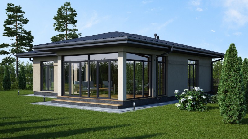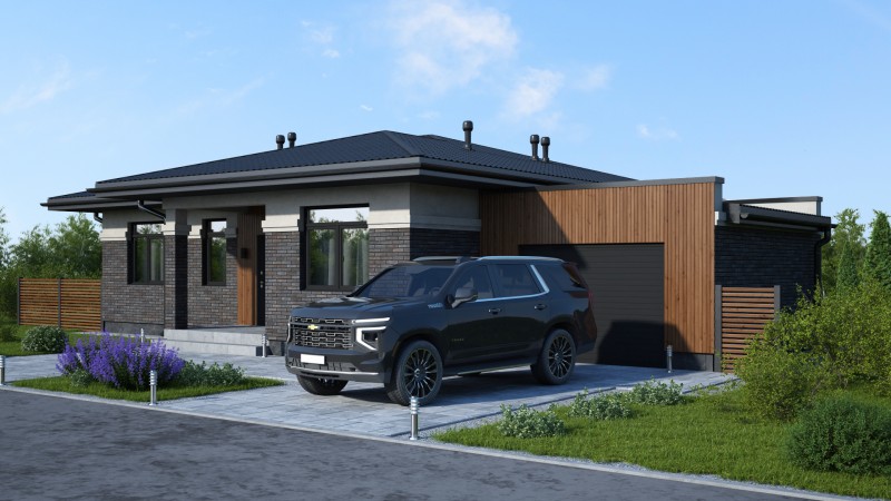 Красивый большой одноэтажный дом с оригинальными комбинированными фасадами, интересной кровлей и гаражом. Имеет три спальни, одна из них мастер спальня с гардеробной и санузлом, просторную кухню гостиную с выходом на террасу, котельную-постирочную, второй санузел, закрытое от осадков крыльцо и просторную террасу, гараж на один авто.
