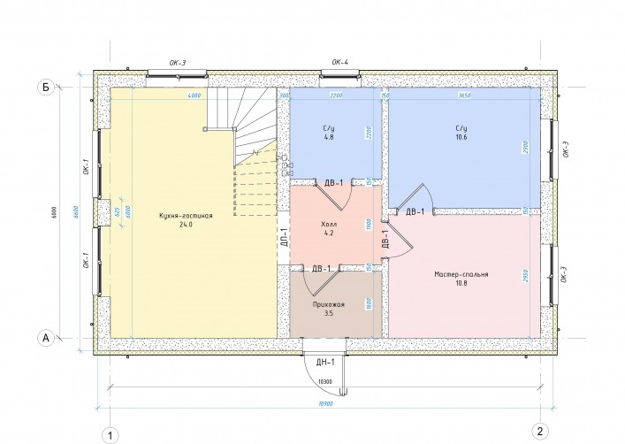 Объемо-планировочные решения дома вмещают просторную кухню-гостиную с большими панорамными окнами второй свет, мастер-спальню на первом этаже, санузел и прихожую. На втором этаже общее пространство с возможностью расположить две спальни и ванную.