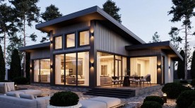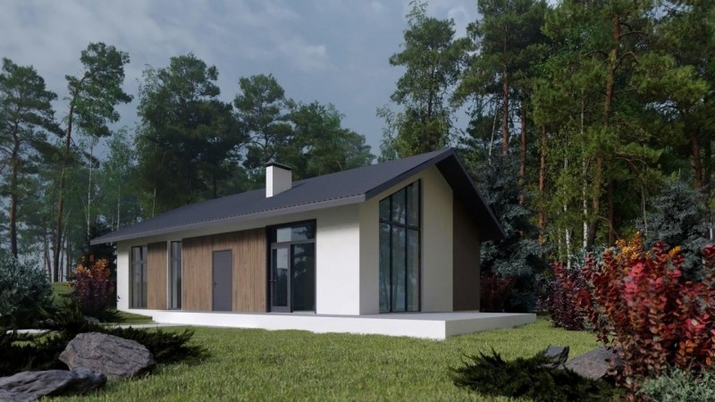 Дом предназначен для небольшой семьи. Внутреннее пространство дома функционально спланировано и разделено на две спальни, просторные кухню-гостиную и ванную комнату. Потолок в гостиной имеет переменную высоту от 2,9 до 4,5 м, а соразмерное окно создает ощущение простора и воздуха в помещении и сравнимо со «вторым светом». Этот проект идеально подойдёт для всех, кто предпочитает простые, функциональные и экономичные решения при выборе дома.