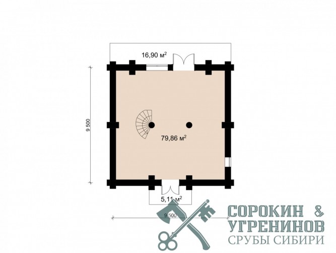 Проект дома из бревна диаметром 460мм, площадь дома 136м2. Размер сруба 9х9 метров. Первый этаж выполнен под свободную планировку, без перегородок и стен, только два несущих столба, вокруг одного из которых лестница на второй этаж. На втором этаже две большие комнаты, которые так же предполагают свободную планировку.