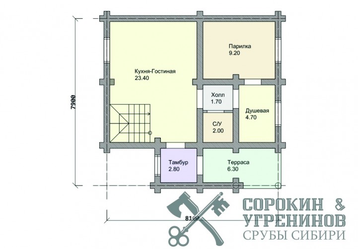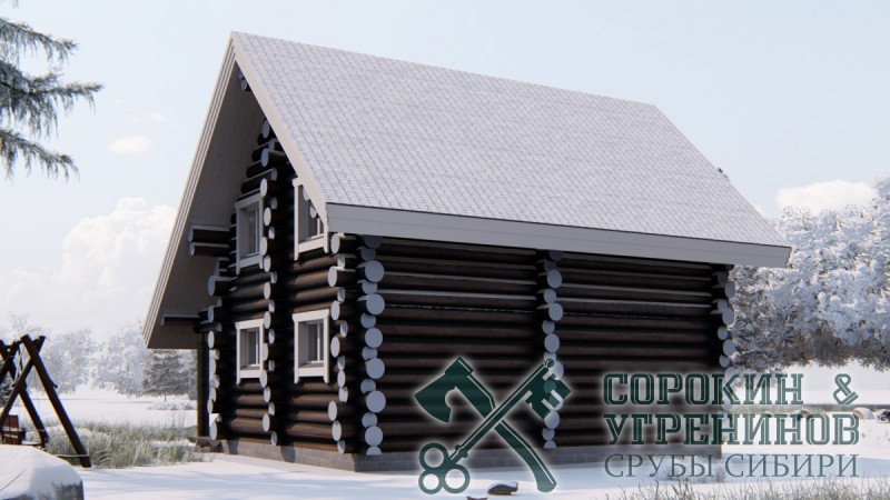 Проект дом-баня из бревна диаметром 320мм, площадь дома 80м2. Размер сруба 8х8 метров. На первом этаже баня, парная и мойка, и гостиная совмещенная с кухней, лестница на второй этаж, две спальные комнаты и небольшой холл. Проект планировался как временное жилье пока строится основной большой дом. Дом-баня установлен в 2010 году, в Новосибирской области в поселке Кудряшовский в живописном месте среди больших сосновых деревьев, на склоне с выходом к берегу реки Обь.