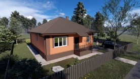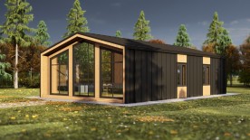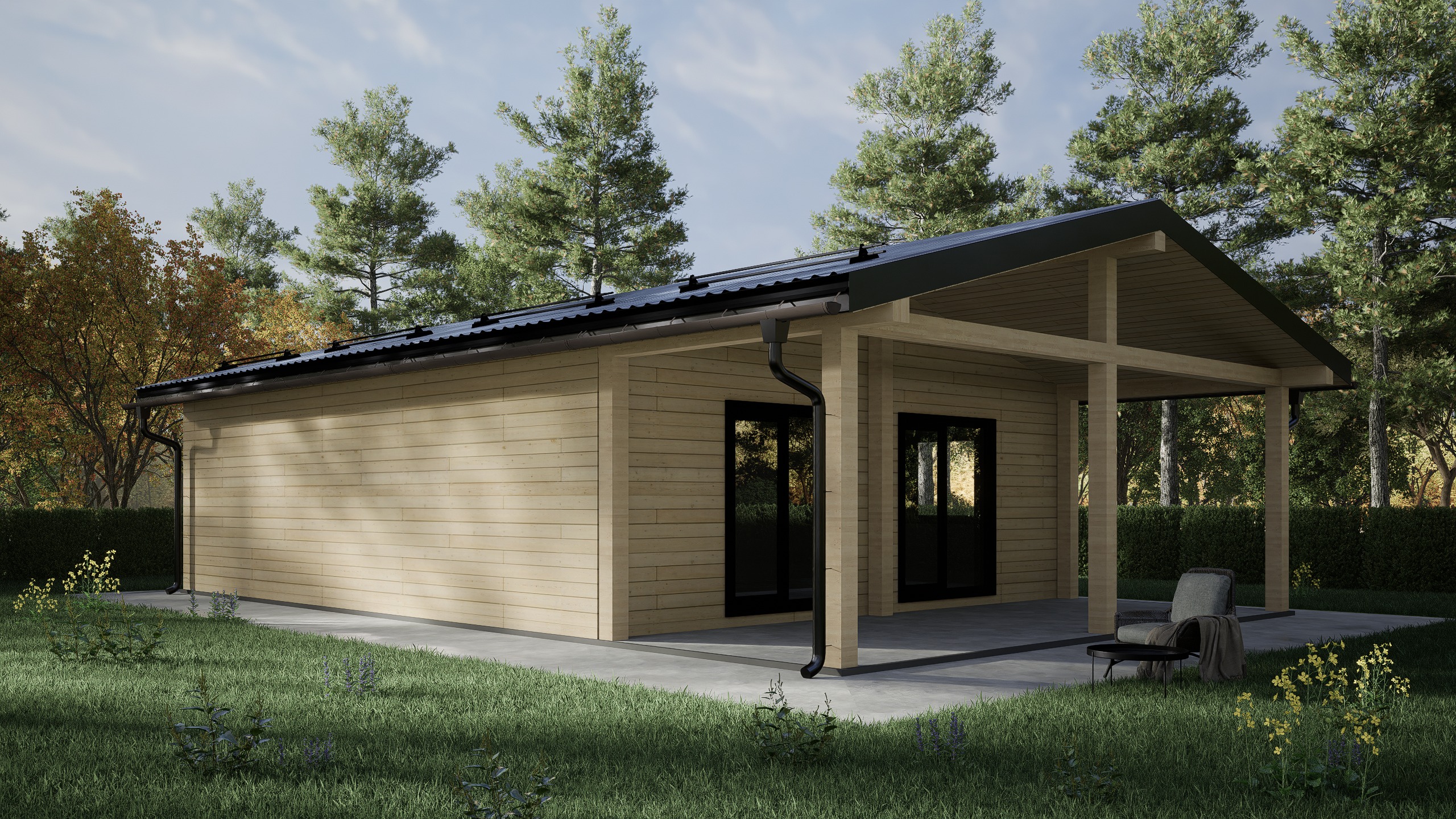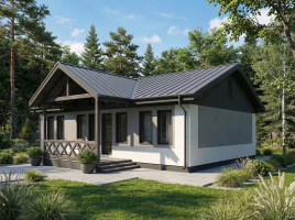 Проект дом-баня из бревна диаметром 300мм, площадь дома 82,9м2. Размер сруба 6,6х15,6 метров. Просторная парная разделена каркасной стеной между мойкой, есть спальная, санузел, гостиная, и терраса. Сруб смотрится красиво, три фасадные фронтона с элементами фермы в стиле post&beam придают строению отличный внешний вид, и второй свет внутри сруба.